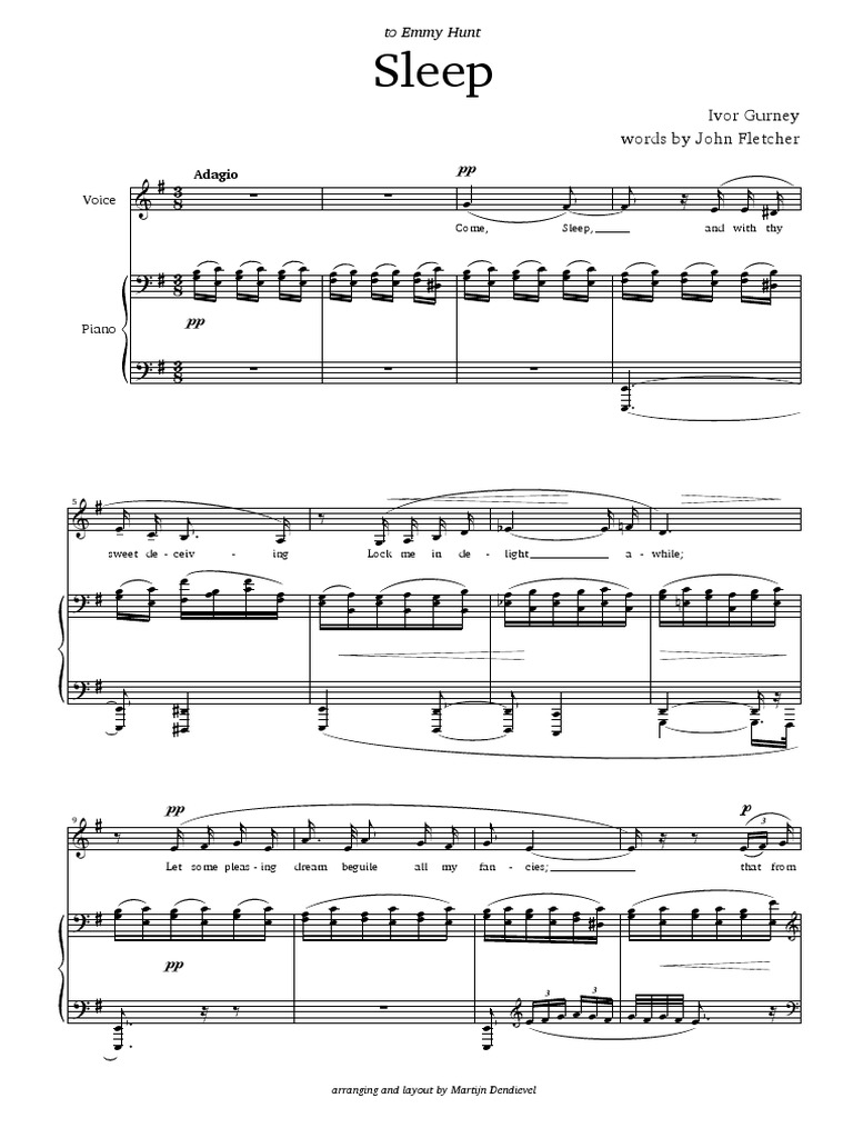 Come, sleep, and with thy sweet deceiving lock me in delight awhile; Though his father was a tailor, gurney's godfather was alfred hunter cheesman, a… gurney read widely in cheesman's library and eventually won a scholarship to the royal college of music, though his studies were. Digital downloads are downloadable sheet music files that can be viewed directly on your computer, tablet or mobile device. Ivor gurney is an english composer, poet and 'scholar of sorts', as he said of himself.